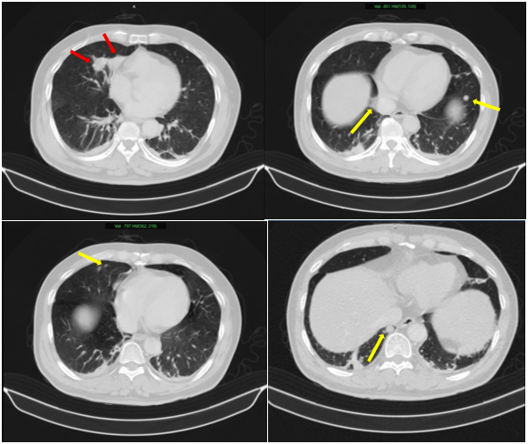 Hình 2: Hình ảnh 02 khối u bờ đa cung ở nhu mô thùy giữa phổi phải, dính vào màng phổi trung thất (mũi tên đỏ) kèm nhiều nốt đặc nhỏ rải rác nhu mô phổi hai bên (mũi tên vàng) gợi ý tổn thương thứ phát.
