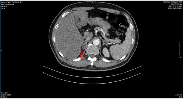 Hình 3: Hình ảnh dày tuyến thượng thận phải tạo nốt có kích thước 19 x 17 mm (mũi tên đỏ).