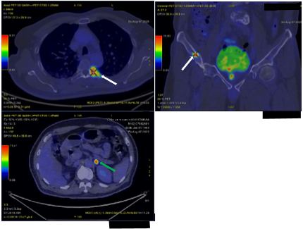 Hình 5: Hình ảnh PET/CT cho thấy: 02 khối u phổi phải, kích thước lớn nhất 16 x 23 mm, xâm lấn vào trung thất (SUVmax: 17,8) và các nốt đặc nhỏ rải rác nhu mô hai phổi, tăng hấp thu FDG (SUV: 10,5) (mũi tên đỏ). Hình ảnh các tổn thương tại xương (mũi tên trắng) tương ứng với các vị trí tổn thương quan sát thấy trên xạ hình xương (SUVmax: 22,2). Hình ảnh nốt tuyến thượng thận trái(mũi tên xanh), tăng hấp thu FDG (SUVmax: 15,2). Hình ảnh tăng hấp thu FDG tại vùng chuyển tiếp,vùng ngoại vi bên phải tuyến tiền liệt và thành dưới bàng quang (SUVmax: 17,1) (mũi tên vàng).