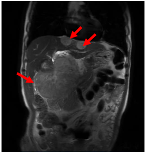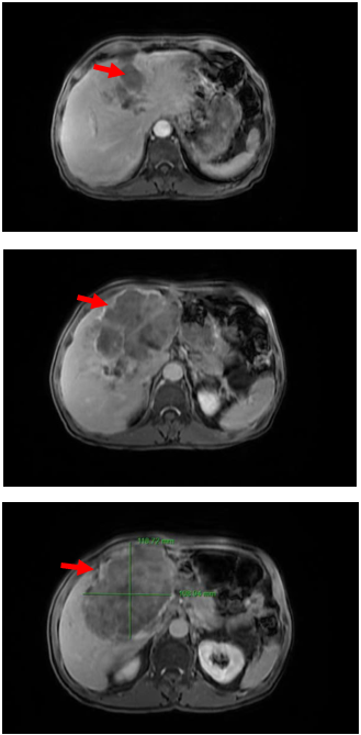 Tại bệnh viện, bệnh nhân được chỉ định chụp cộng hưởng từ ổ bụng cho hình ảnh: Khối rốn gan kích thước 100x110mm và các nốt gan 2 bên kích thước khoảng 12mm, xâm lấn gây huyết khối nhánh trái TMC. Bệnh nhân được chẩn đoán U gan (theo dõi thể mix HCC – ICC)/ Viêm gan B mạn tính.Bệnh nhân được điều trị Viêm gan B => Chuyển tới Trung tâm Y học hạt nhân và Ung bướu Bệnh viện Bạch Mai