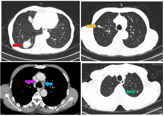 Hình 1: Hình ảnh chụp CT ngực cho thấy: Phổi phải phân thùy S10 có khối ~ 40x30mm bờ tua gai (mũi tên đỏ); thùy trên, thùy dưới còn lại có vài nốt đặc, lớn nhất đường kính 9mm (mũi tên màu cam); Phổi trái: thùy trên có nốt đặc đường kính 3m ngấm thuốc, bờ tua gai (mũi tên xanh lá cây). Nhiều hạch trung thất, lớn nhất ~ 16x12mm (mũi tên xanh dương), có hạch vôi hóa (mũi tên hồng)- Chụp cộng hưởng từ sọ não tháng 10/2024 (trước điều trị)
