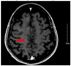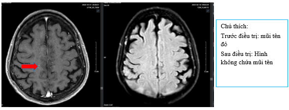Hình 8: So sánh phi chụp cộng hưởng từ sọ não trước điều trị có nốt tăng ngấm thuốc sau tiêm vùng vỏ não thùy trán thùy đỉnh phải ~ 3mm (mũi tên đỏ) của phim chụp trước điều trị. Hiện tại chụp lại phim MRI não đã không còn phát hiện các nốt ngấm thuốc bất thường.