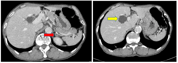 Hình 9: So sánh phim chụp CT bụng trước điều trị nốt tuyến thượng thận ~11mm (mũi tên đỏ) đã giảm nhẹ kích thước sau điều trị còn ~9mm (mũi tên vàng)