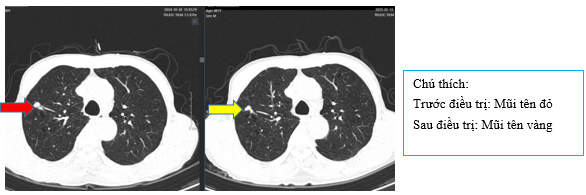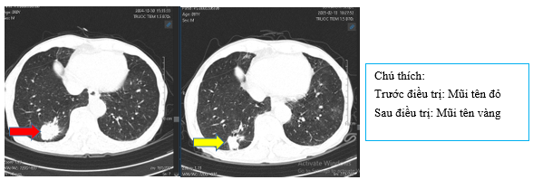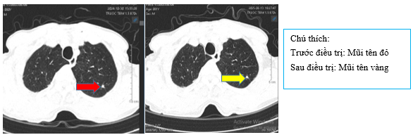 Hình 4: So sánh phim chụp cắt lớp vi tính lồng ngực trước điều trị kích thước khối u thùy dưới phổi phải từ 40x30mm (mũi tên đỏ) sau điều trị giảm còn 26x20mm (mũi tên vàng)