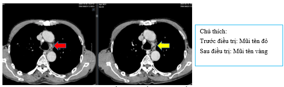 Hình 7: Hình ảnh các hạch trung thất trước điều trị lớn nhất ~16x12mm (mũi tên đỏ) giảm nhẹ sau điều trị còn 15x12mm (mũi tên vàng)