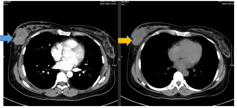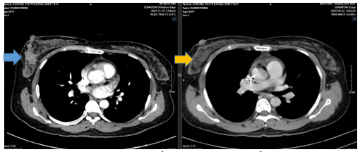 Hình 3: Trước điều trị khối u vú phải ~70x59x37mm (mũi tên xanh), xâm lấn da ~34mm. Hạch thuộc chặng 1, lớn nhất ~9x14mm, hạch chặng 2 ~5mm. Sau điều trị u vú phải ~16x23x36mm (sau điều trị mũi tên vàng), tổn thương xâm lấn da ~ 25mm. Hố nách bên phải chặng I có vài hach, còn rốn hạch vỏ hạch dày, lớn nhất ~ 4x6mm.- CT ngực trước và sau điều trị tân bổ trợ