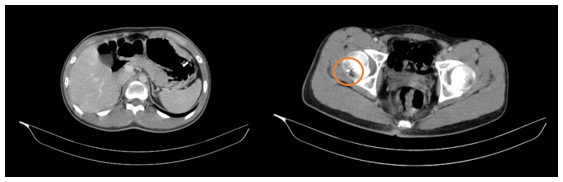 Hình 1. Hình ảnh dày thành dạ dày đoạn thân vị. Ổ tiêu xương có viền đặc xương chỏm xương đùi phải (vòng tròn màu cam)