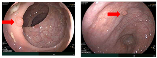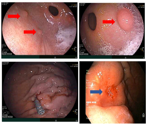 Hình 3. Hình ảnh các polyp rải rác ở đại tràng (mũi tên đỏ)