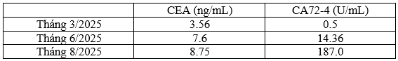 - Chỉ điểm u: CEA: 1.32 ng/mL;CA72-4: 0.51 U/mL