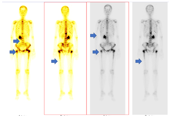 Hình 7. Hình ảnh di căn xương đa ổ trên xạ hình xương (các mũi tên màu xanh)