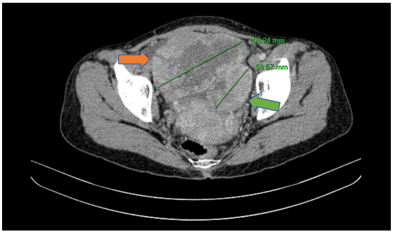 Hình 5. Hình ảnh khối buồng trứng phải kích thước ~108mm (mũi tên màu cam), khối buồng trứng trái kích thước ~58mm (mũi tên màu xanh lục) trên phim chụp cắt lớp vi tính.