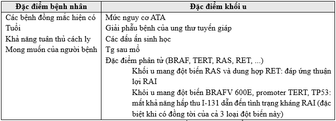 Việc chỉ định RAI cần được cá thể hóa trên nhiều đặc điểm cụ thể của bệnh nhân và khối u, bao gồm: