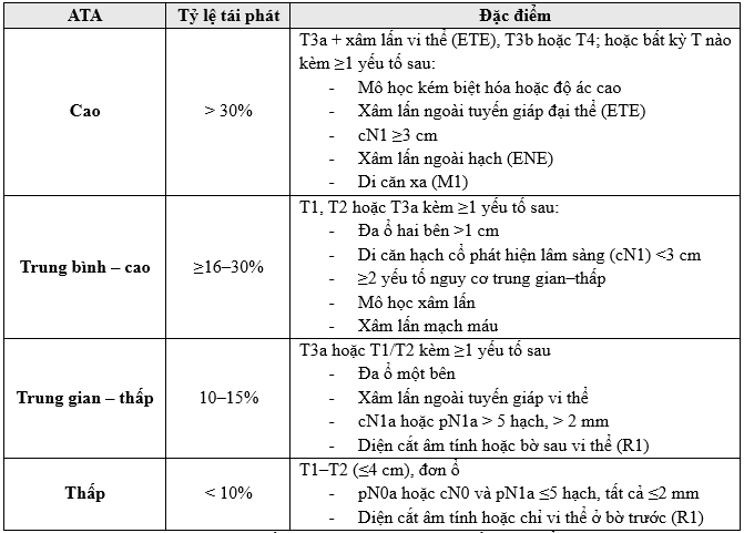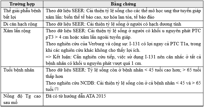 Trong hướng dẫn ATA 2015 gợi ý rằng việc sử dụng I-131 có hiệu quả cao trên những nhóm bệnh nhân có: giải phẫu bệnh ung thư tuyến giáp bất lợi, hạch di căn rộng,nồng độ Tg sau mổ cao, lớn tuổi. Trong hướng dẫn ATA 2025 cho thấy rằng không phải tất cả tiêu chí trong ATA nguy cơ trung bình đều dự báo cùng một nguy cơ tái phát, vì vậy chia thành 2 mức nguy cơ nhỏ hơn: (1) Nguy cơ trung bình – thấp,(2) Nguy cơ trung bình – cao.
