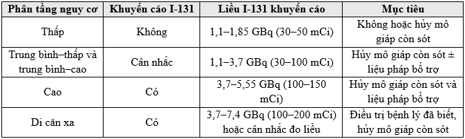Trong các trường hợp chọn lọc sử dụng I-131 ở bệnh nhân nguy cơ thấp dựa trên đánh giá nguy cơ sau phẫu thuật, nên sử dụng liều thấp 1,1–1,85 Gbq (30–50 mCi)