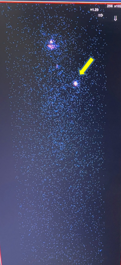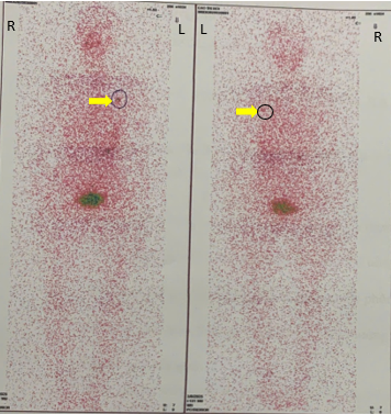 Hình 5. Hình ảnh xạ hình toàn thân sau điều trị I-131: tăng hoạt độ phóng xạ tại vùng ngực trái (mũi tên vàng).