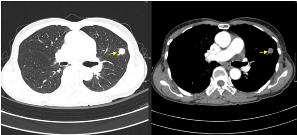 Hình 2. Hình chụp CT ngực có nốt đặc thùy trên phổi trái kích thước 10x11mm.