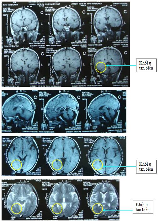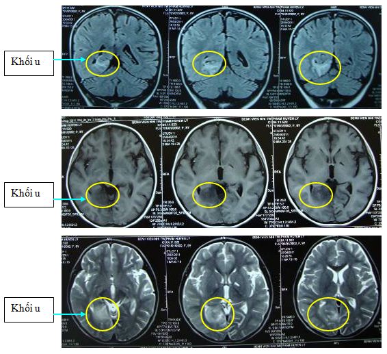 Tại đây bệnh nhân được chụp phim cộng hưởng từ sọ não cho thấy có khối u vùng chẩm phải đường kính 30x30x29mm nghĩ nhiều đến U sao bào (Astrocytoma)