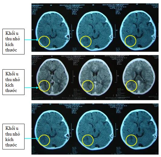 Sau điều trị xạ trị 36Gy; bệnh nhân được chỉ định chụp phim cắt lớp vi tính sọ não để đánh giá. Trên hình ảnh cắt lớp vi tính sọ não cho thấy: khối tổn thương giảm tỷ trọng vùng chẩm phải, kích thước 10x15mm và đã thu nhỏ nhiều so với trước điều trị.