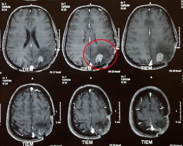 Hình ảnh phim chụp cộng hưởng từ sọ não trước mổ cho thấy khối u não vị trí thùy đỉnh - chẩm bên trái, kích thước 45 x 56mm, ngấm thuốc mạnh, phù não rộng xung quanh.