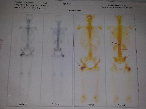 Hình 1: Hình ảnh tổn thương xương tại cột sống thắt lưng, khớp háng phải, xương cánh chậu phải