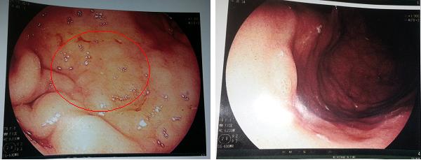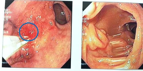 Hình 2: Mặt trước hang vị dạ dày có tổn thương gồ ghề đường kính 2cm (vòng tròn xanh) Đã được sinh thiết làm xét nghiệm mô bệnh học (giải phẫu bệnh)