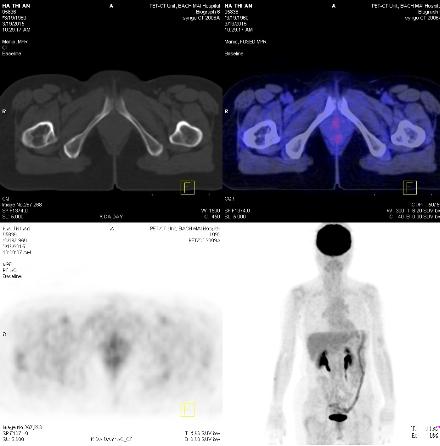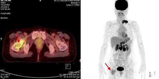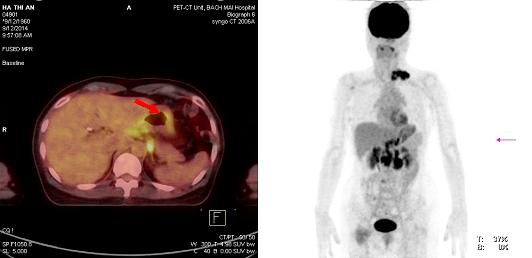 Chụp PET/CT đánh giá lại: Thành dạ dày tăng hấp thu 18F-FDG nhẹ, sỏi đường mật ngoài gan, tổn thương vùng cổ xương đùi phải không tăng hấp thu 18F-FDG. Không thấy hình ảnh tăng hấp thu và chuyển hóa 18F-FDG bất thường tại các vị trí khác trong cơ thể.