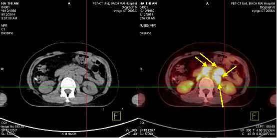Hình 4: Hình ảnh nhiều tổn thương di căn hạch ổ bụng tăng hấp thu 18F-FDG, kích thước từ 2,1- 8,8cm, max SUV: 8,52 (mũi tên vàng)
