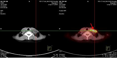 Hình 5: Hình ảnh tăng hấp thu 18F-FDG hạch thượng đòn trái, nhiều hạch kích thước 1,5-2,5 cm tạo thành chùm kích thước 6,2x3,2x3,6cm, max SUV: 8,7(mũi tên đỏ)