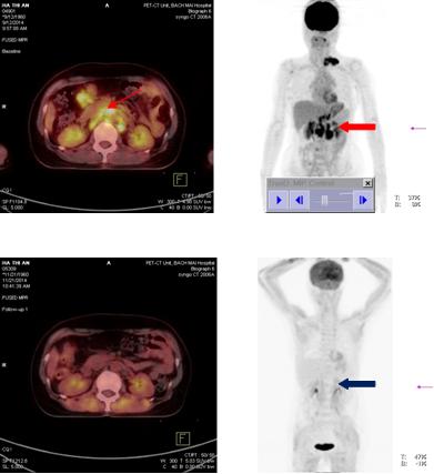 Sau điều trị: Hình ảnh hạch ổ bụng sau điều trị 3 chu kì hóa chất: Hạch ổ bụng đã tan hết. (Mũi tên xanh: không còn tổn thương)