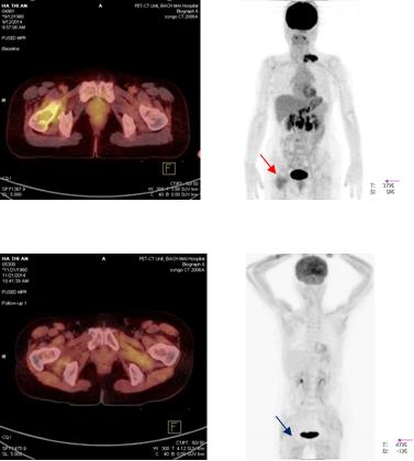 Sau điều trị: Hình ảnh tổn thương tại cổ xương đùi phải sau điều trị hóa chất: Không tăng hấp thu FDG (mũi tên xanh)