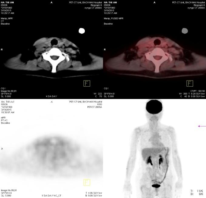 Chụp PET/CT: Không thấy hình ảnh tăng hấp thu và chuyển hóa bất thường 18F-FDG trong cơ thể.