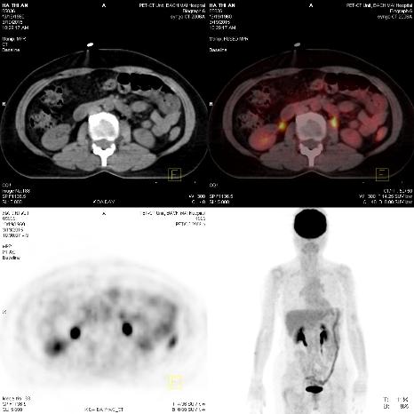 Bệnh nhân được chụp PET/CT nhằm mục đích đánh giá giai đoạn bệnh cho thấy: Hình ảnh tăng hấp thu dược chất phóng xạ tại hạch thượng đòn trái, thành dạ dày, cổ xương đùi phải, và hạch ổ bụng.
