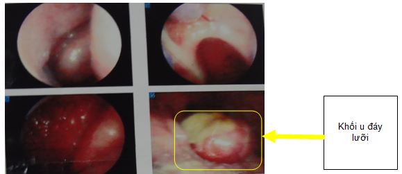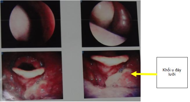 Họng: vùng đáy lưỡi có khối u kích thước 2x2cm, giới hạn rõ, u nằm trên mặt trước thanh thiệt, chưa xâm lấn vào thanh quản. Thanh quản: hai dây thanh nhẵn, di động bình thường