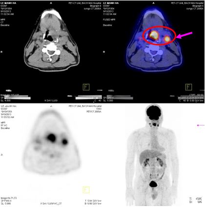 - Vùng đáy lưỡi có khối lớn kéo dài đến thanh quản kích thước: 2,4x3,6x2,9cm, tăng hấp thu F18- FDG max SUV=8,28.
