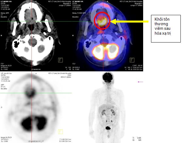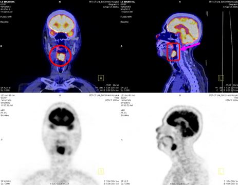 + Tháng 12 năm 2013, bệnh nhân được chup PET/CT lần 2 sau khi kết thúc xạ trị và 4 đợt hoá trị. Trên hình ảnh PET/CT cho thấy: vùng đáy lưỡi có khối tăng hấp thu F-18 FDG, kích thước 3,9x4,3x3,0cm, theo dõi tổn thương viêm sau xạ trị. Không thấy hạch cổ tăng hấp thu F-18 FDG bất thường.