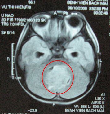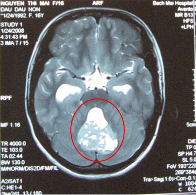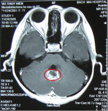 Trường hợp 1: Bệnh nhi Nguyễn Thúy H, nữ 8 tuổi vào viện vì lí do đau đầu, nôn, sụp mi mắt trái. Bệnh nhân đã được chụp cộng hưởng từ sọ não: cho thấy hình ảnh khối tổn thương choán chỗ tại đường giữa của tiểu não kích thước 4x3cm.