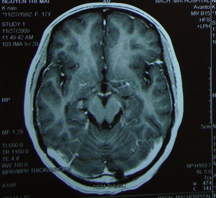 Trên film chụp cắt lớp vi tính sọ não và cộng hưởng từ sọ não thấy hình ảnh khối tổn thương choán chỗ vùng hố sau kích thước 3,5x3cm.