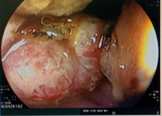 • Hình 1: Hình ảnh nội soi đại tràng cho thấy tại vị trí đại tràng sigma có khối sùi loét, chiếm gần hết chu vi lòng đại tràng, máy soi không đi tiếp được.