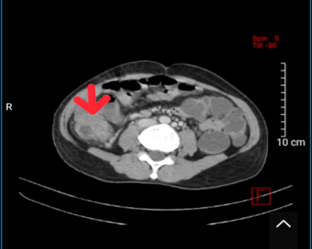Cách vào viện 2 tháng, người bệnh thấy đau bụng âm ỉ vùng hố chậu phải, đau không lan, liên tục cả ngày, không nôn, không sốt, đại tiện không phát hiện bất thường, không sụt cân. Người bệnh khám và điều trị tại địa phương phát hiện u đại tràng chuyển bệnh viện Bạch Mai.
