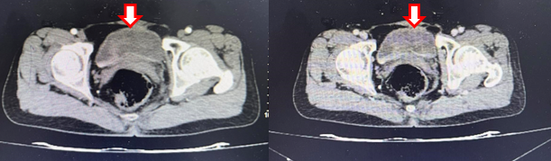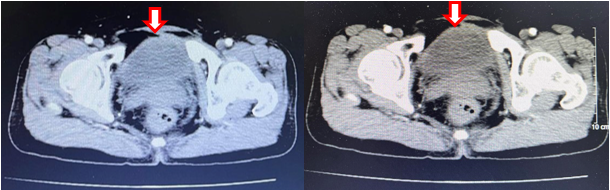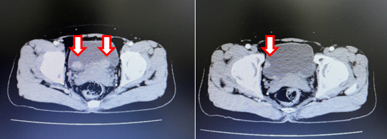 Hình 1: Cắt lớp vi tính ổ bụng (09/06/22): Hình ảnh nhiều khối ngấm thuốc bàng quang (mũi tên) – Theo dõi u bàng quang đa ổ