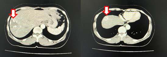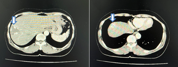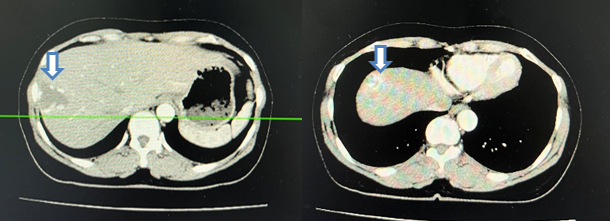 Hình 2: Cắt lớp vi tính ổ bụng (09/06/22): Hình ảnh 2 khối u máu gan ở hạ phân thùy VII-VIII kích thước lần lượt là 35x38mm và 19x20mm (mũi tên)