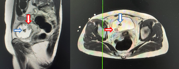 Hình 3: Chụp cộng hưởng từ ổ bụng, tập trung tiểu khung (13/06/22): Hình ảnh u bàng quang T2aNxMx, vị trí 7h có nốt kích thước 12x16mm (mũi tên đỏ), trong lòng có hình ảnh sonde tiểu (mũi tên xanh), không có sỏi