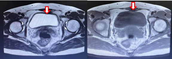 Hình 5: Cộng hưởng từ tiểu khung (02/02/23): Hình ảnh dày nhẹ thành bàng quang quanh chu vi (mũi tên). Hiện không thấy tổn thương nghi ngờ thứ phát