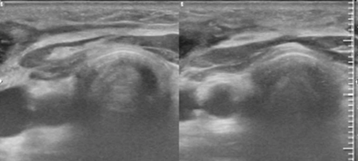 Hình 10: Siêu âm tuyến giáp (08/04/2024): Hình ảnh phù nề nhẹ phần mềm dưới da tương ứng vị trí vết mổ