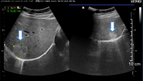 Hình 11: Siêu âm ổ bụng (08/04/2024): Hình ảnh u máu gan (P) (mũi tên); Bàng quang thành nhẵn, nước tiểu trong, không có sỏi