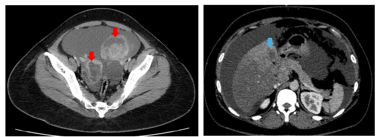 Hình 1: Chụp CT ổ bụng: Hình ảnh tiểu khung hai bên có cấu trúc hỗn hợp, gồm phần dịch và phần nang, lớn nhất kích thước ~50x70mm (mũi tên đỏ). Nhu mô gan hạ phân thùy IV có khối kích thước 28x33mm, sau tiêm ngấm thuốc vỏ, theo dõi thứ phát, nhu mô gan lân cận, có nốt đường kính ~5mm, ngấm thuốc thì động mạch (mũi tên xanh)