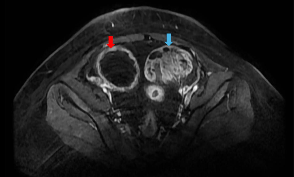 Hình 2: Chụp cộng hưởng từ tiểu khung: Buồng trứng phải: nang lớn kích thước ~73x89mm, dịch bên trong có tín hiệu khá đồng nhất (mũi tên đỏ). Buồng trứng trái: nang lớn kích thước ~74x55mm, có thành phần đặc bên trong kích thước 67x38mm, ngấm thuốc sau tiêm (mũi tên xanh)