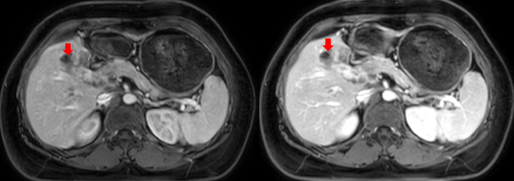 Hình 4: Cộng hưởng từ ổ bụng: Hình ảnh nhu mô gan có các nốt, lớn nhất kích thước 26x17mm, sau tiêm ngấm thuốc dạng viền ( mũi tên đỏ). Lời bàn:Ung thư tế bào nhỏ của buồng trứng thể tăng canxi là bệnh lý hiếm gặp, các hiểu biết hiện tại đều dựa trên các báo cáo ca bệnh và loạt ca bệnh nhỏ. Bệnh tiên lượng xấu, đáp ứng kém với điều trị, tỷ lệ sống ước tính ở bất kể giai đoạn trong một năm là 50% và tỷ lệ sống năm năm dưới 10%.