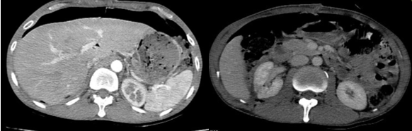 Hình 3. Hình ảnh chụp cắt lớp vi tính ổ bụng: Hình ảnh sau mổ u sau phúc mạc bên phải, hiện thấy tụ dịch-khí khoang sau phúc mạc (sau mổ 1 tuần)