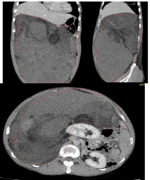 - CTscanner ổ bụng: Phát triển từ khoang sau phúc mạc bên phải có khối lớn kích thước khoảng 253x127mm, tỷ trọng hỗn hợp gồm phần đặc ngấm thuốc sau tiêm, thành phần nang dịch, mỡ và các ổ tăng tỷ trọng tự nhiên trước tiêm dạng máu cục lớn nhất kích thước khoảng 83x64 mm theo dõi liposarcoma. Khối lớn đẩy thận phải ra trước, sang trái sát đường giữa, đẩy nhu mô gan lên trên và đẩy các quai ruột trong ổ bụng sang trái. Không ghi nhận tổn thương ở các cơ quan khác.